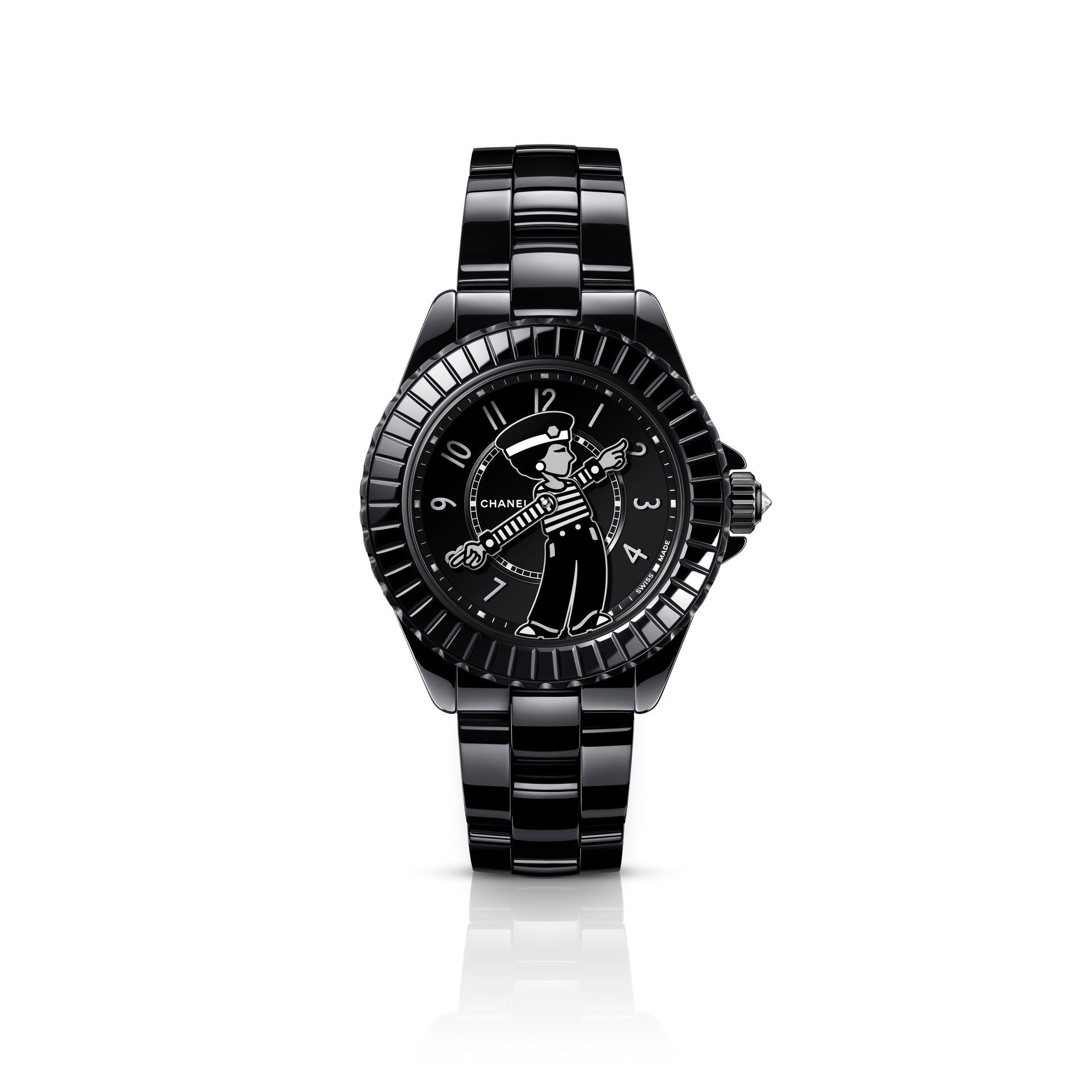 Inspired by a photograph of Mademoiselle Chanel taken in her garden at La Pausa, her villa in the South of France, this interpretation of the J12 watch features her silhouette clad in a stripped jersey and sailor's pants.
