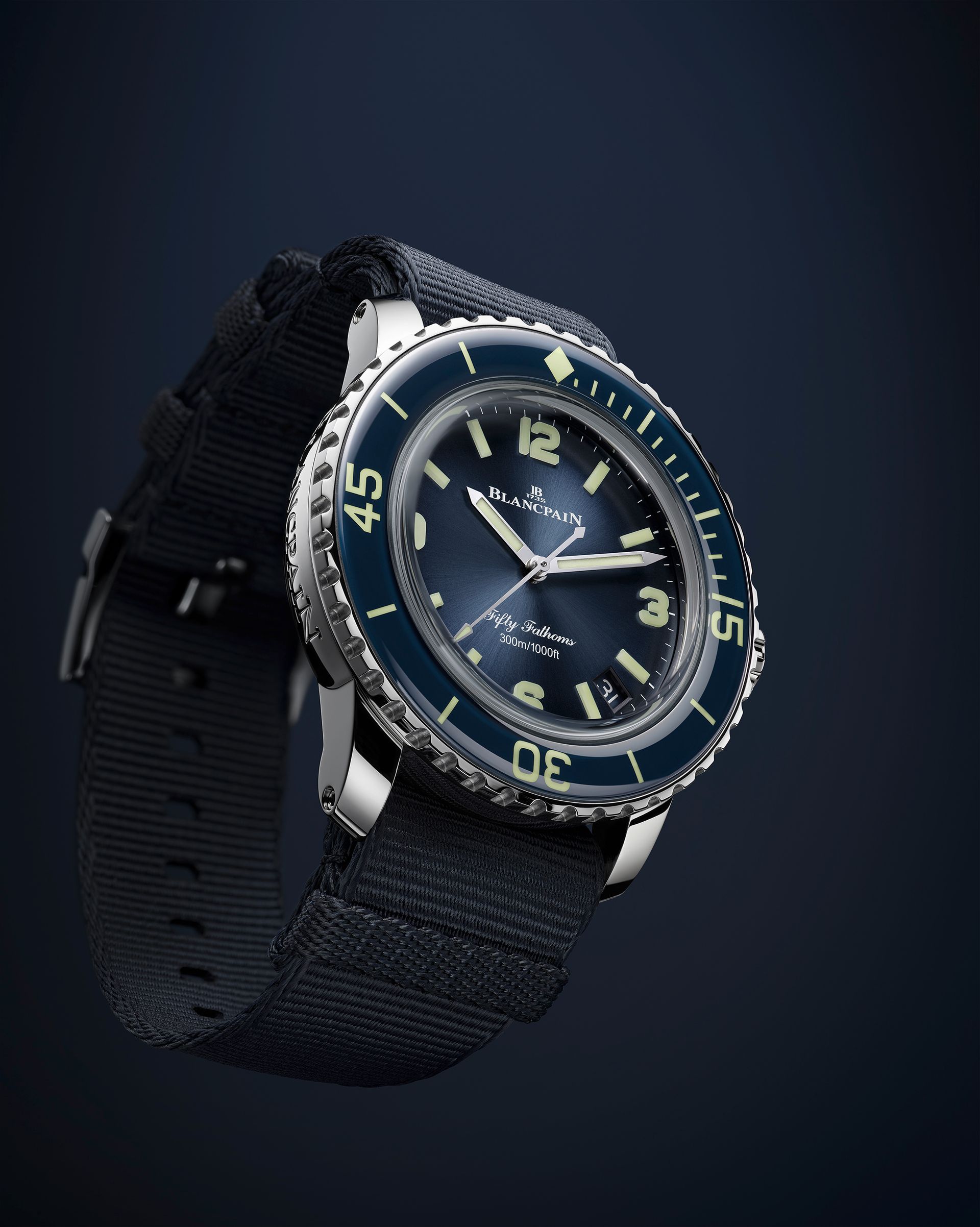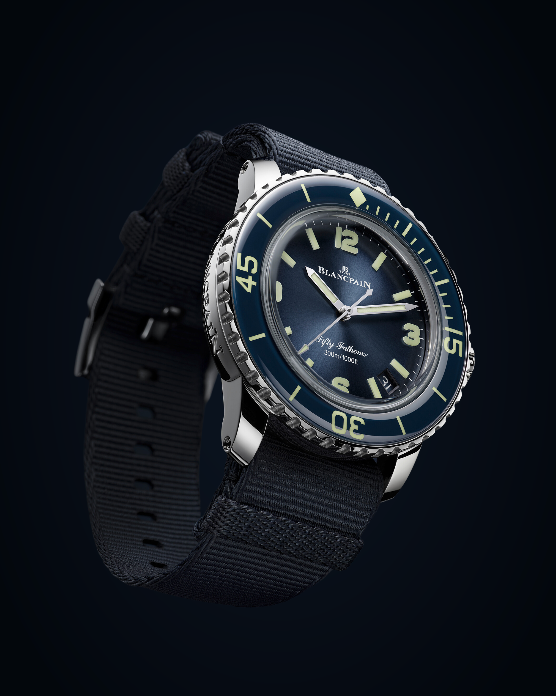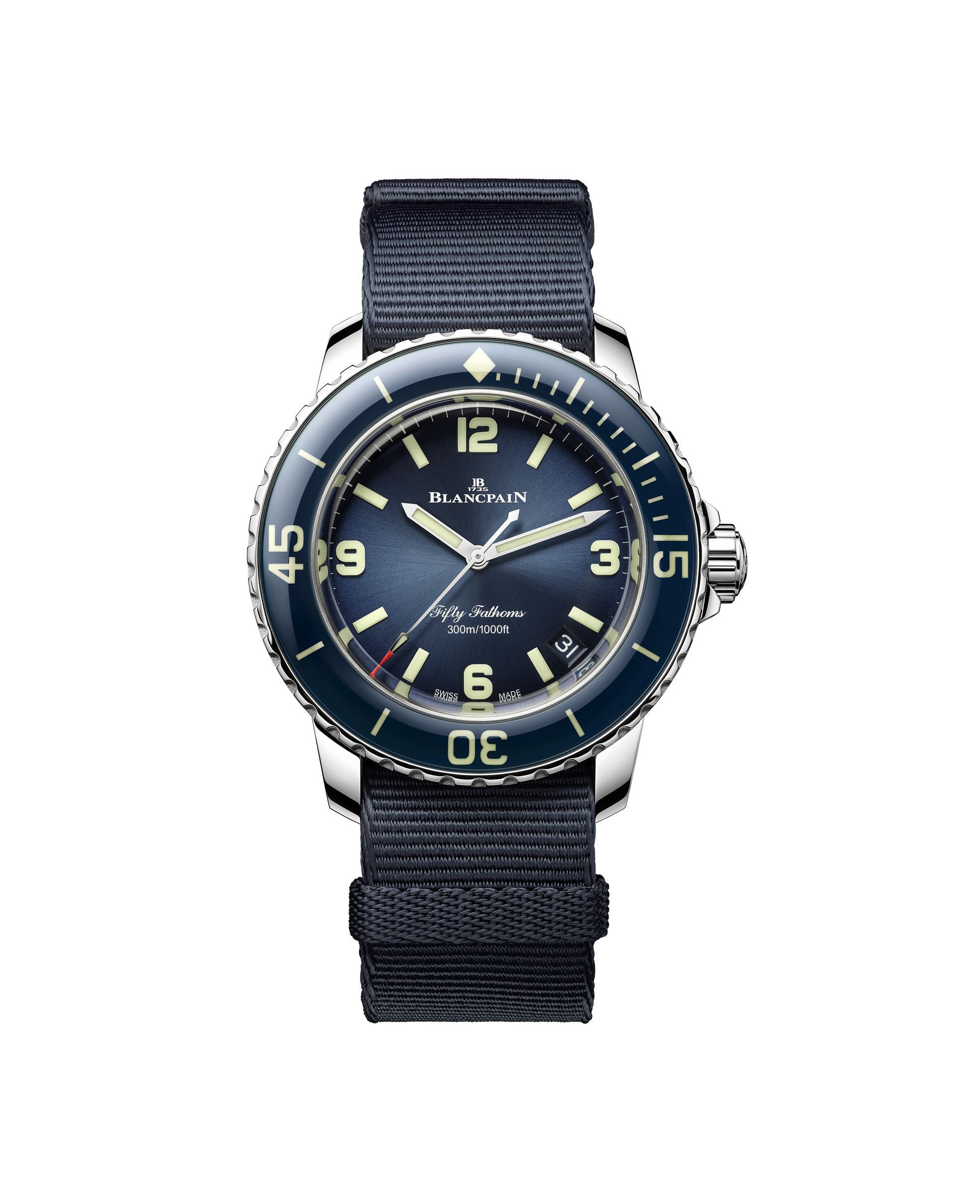 This special edition of the Fifty Fathoms 70th Anniversary Act 1, has been inspired by the 1953 original Fifty Fathoms as well as two other landmark editions: the 2003 50th Anniversary Fifty and the 2007 Fifty Fathoms, which marked the birth of the new generations of this icon. The DNA of all three shines through this unique edition with its blue unidirectional bezel, bombé in form, bringing exceptional visual depth and constructed from sapphire with its extraordinary resistance to scratches; its graduated blue dial, darker on the outer perimeter with luminous indexes, Arabics at 3, 6, 9, and 12 and stick markers at the five minute marks, each fashioned from multiple layers of Super-LumiNova to bestow extra depth;