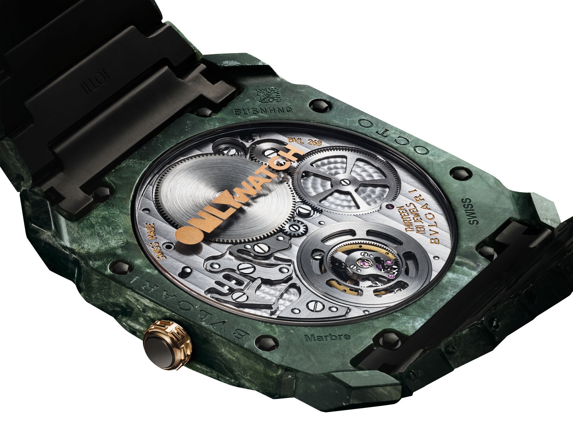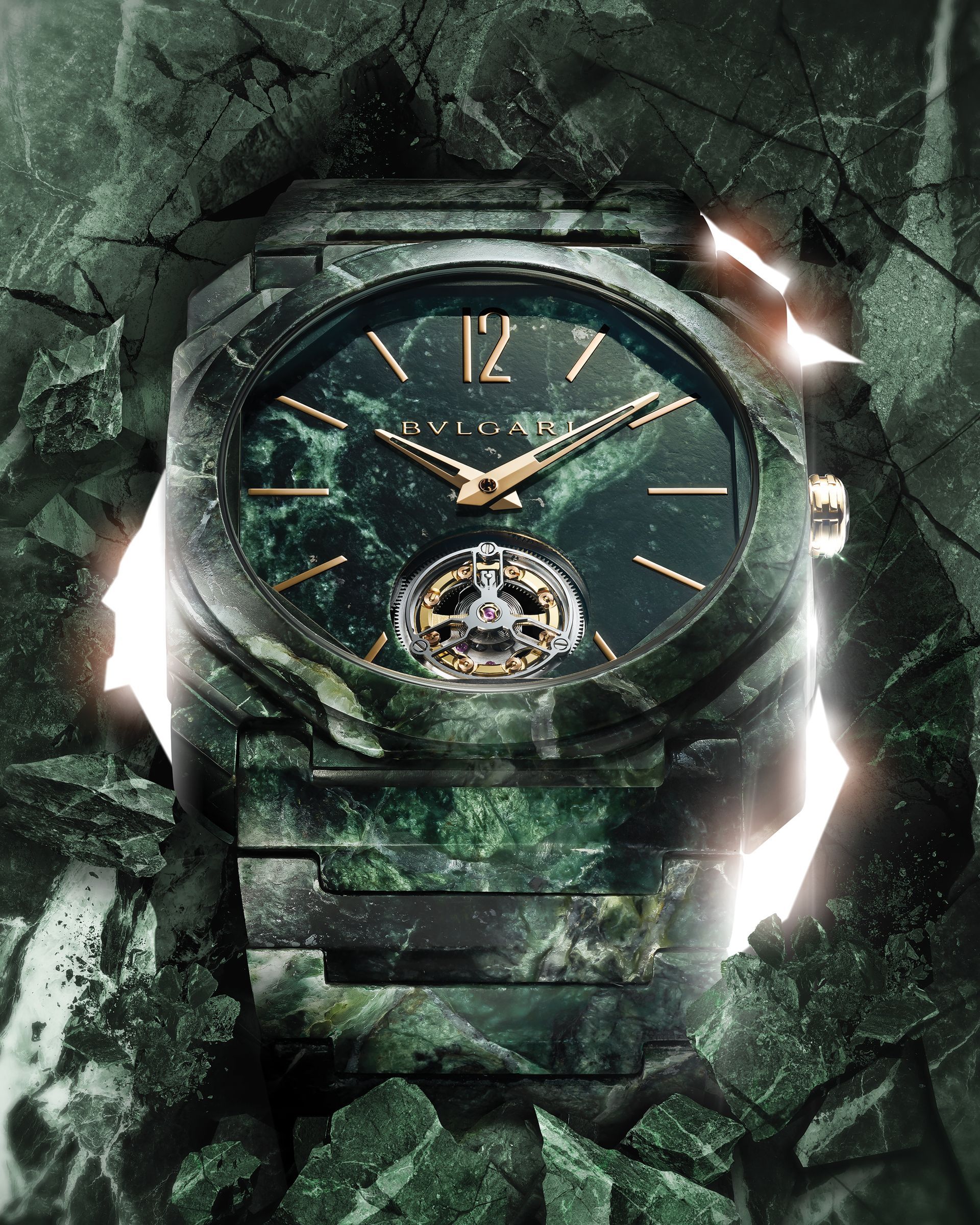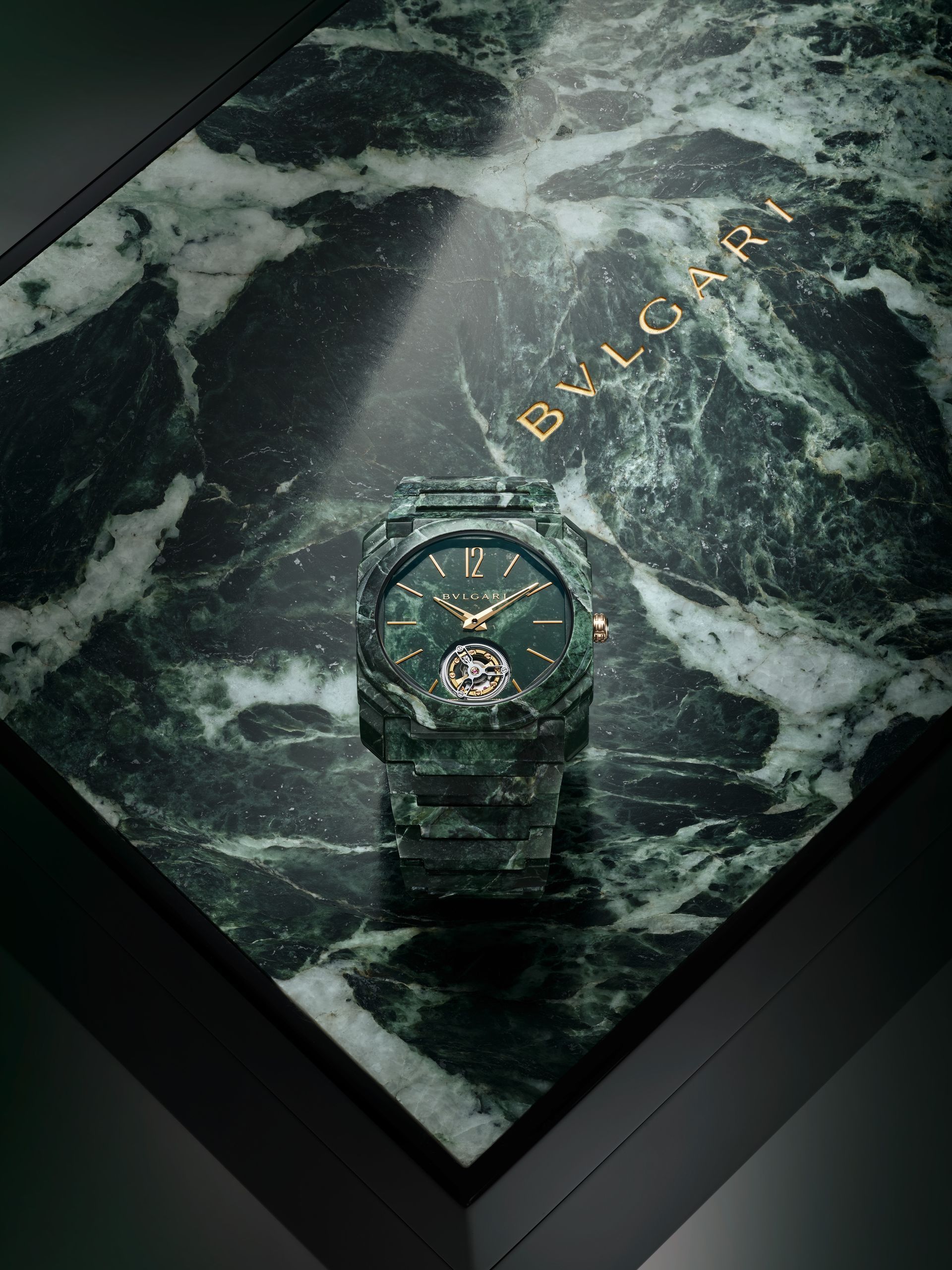 The Octo Finissimo Tourbillon is a legend: It is the 1st world record of a series of 9, established in 2014 with its 1.95mm thin movement. Bvlgari has reached a milestone in the development of ultra-thin watches since. Produced as a one-off and with no equivalent in the watchmaking world, Bulgari intends to etch the 10th Edition of Only Watch in stone for all time. The green marble used for this spectacular watch, named Verde di Alpi, comes from the Aosta Valley, the natural passage linking Switzerland and Italy, though the Alps. Its dominant colour in nature, evoking abundance, growth and energy, is offset with white veins, recalling the serpentines of alpine forests and snowy peaks.