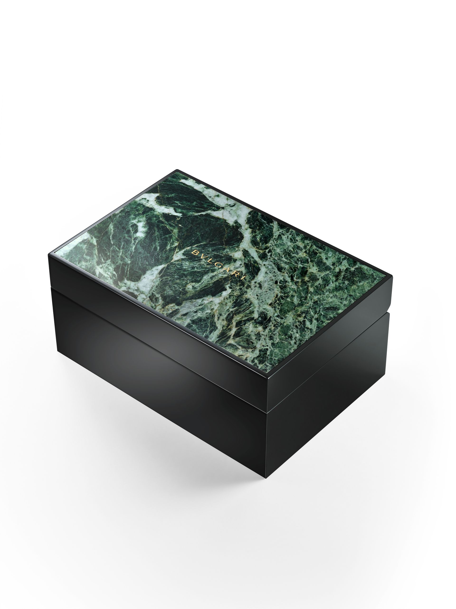 The inspiration behind the piece came from ancient times when marble was featured in Roman architecture by most skillful artists of all time. Marble expressed Rome’s history and glory and was adopted in 1934 when the Bulgari store was enlarged and refurbished by the renowned Italian architect Florestano Di Fausto: he decided to unify the two separate buildings at ground floor with travertine marble and designed four large openings for display windows and a central doorway, all framed by green African marble cornices. Marble was also present inside the store in the floors decorated with the iconic eight-pointed star inlay, as well as in the columns and tables.