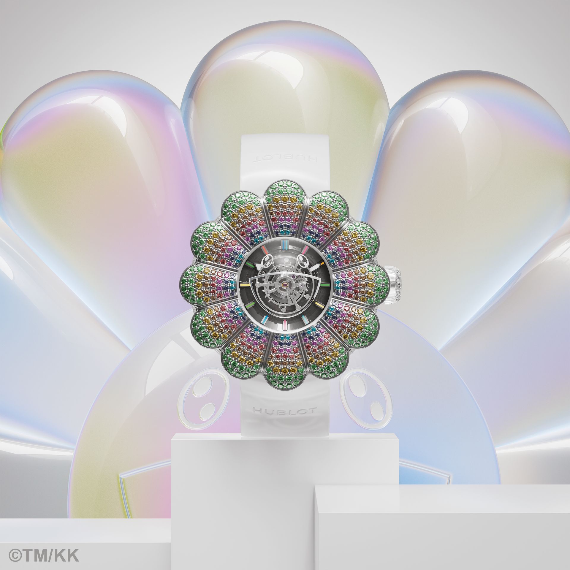Designed with Takashi Murakami — Sapphire watch case — Central flying tourbillon — 444 gemstones — Colourful luminescent indices — Power reserve: 150 hours — Decorated rubber strap