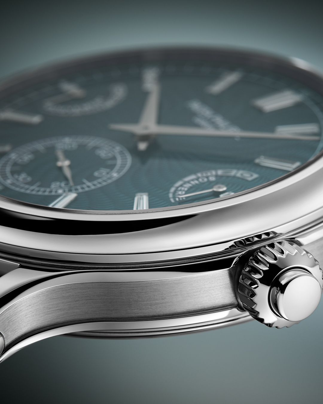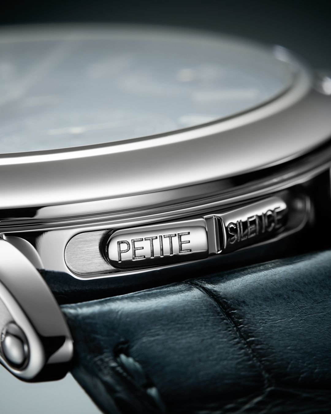 Grand Feu blue green enamel hand-guilloched dial with a swirling pattern (flinqué enamel), set with 12 baguette-cut diamond hour markers (0.45 ct) — 18K gold dial plate — Power reserve indicators for the movement and for the strikework with transfer-printed “only one” inscription — White gold faceted “Dauphine” hands — Jumping small seconds at 6 o’clock