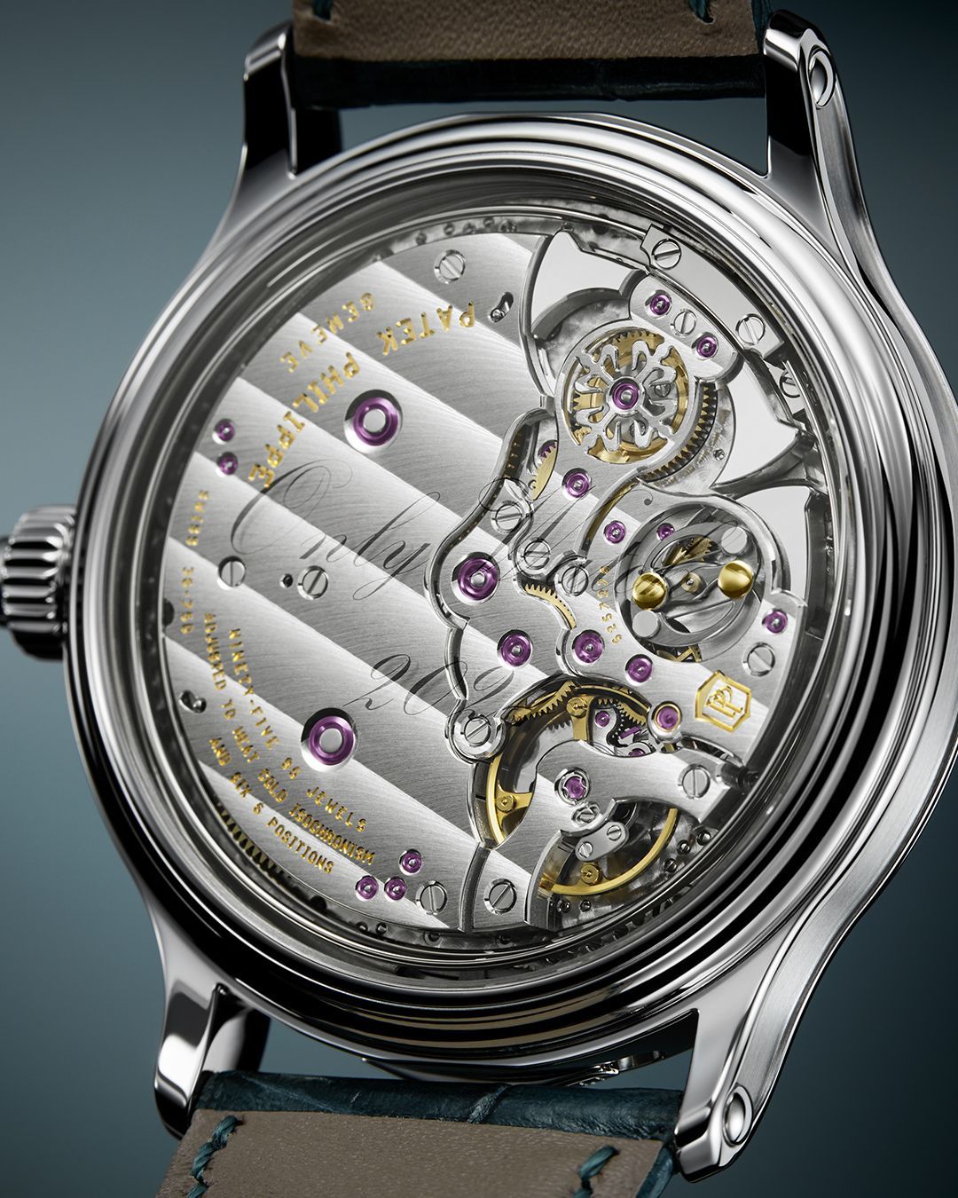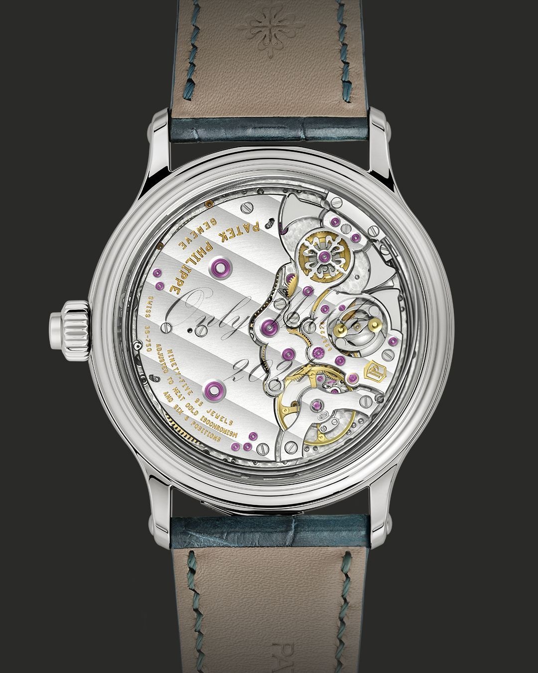 The sapphire crystal case back bears the metallized inscription “Only Watch 2024”. This unique timepiece is fitted on a patinated blue green alligator leather strap with fold-over clasp.