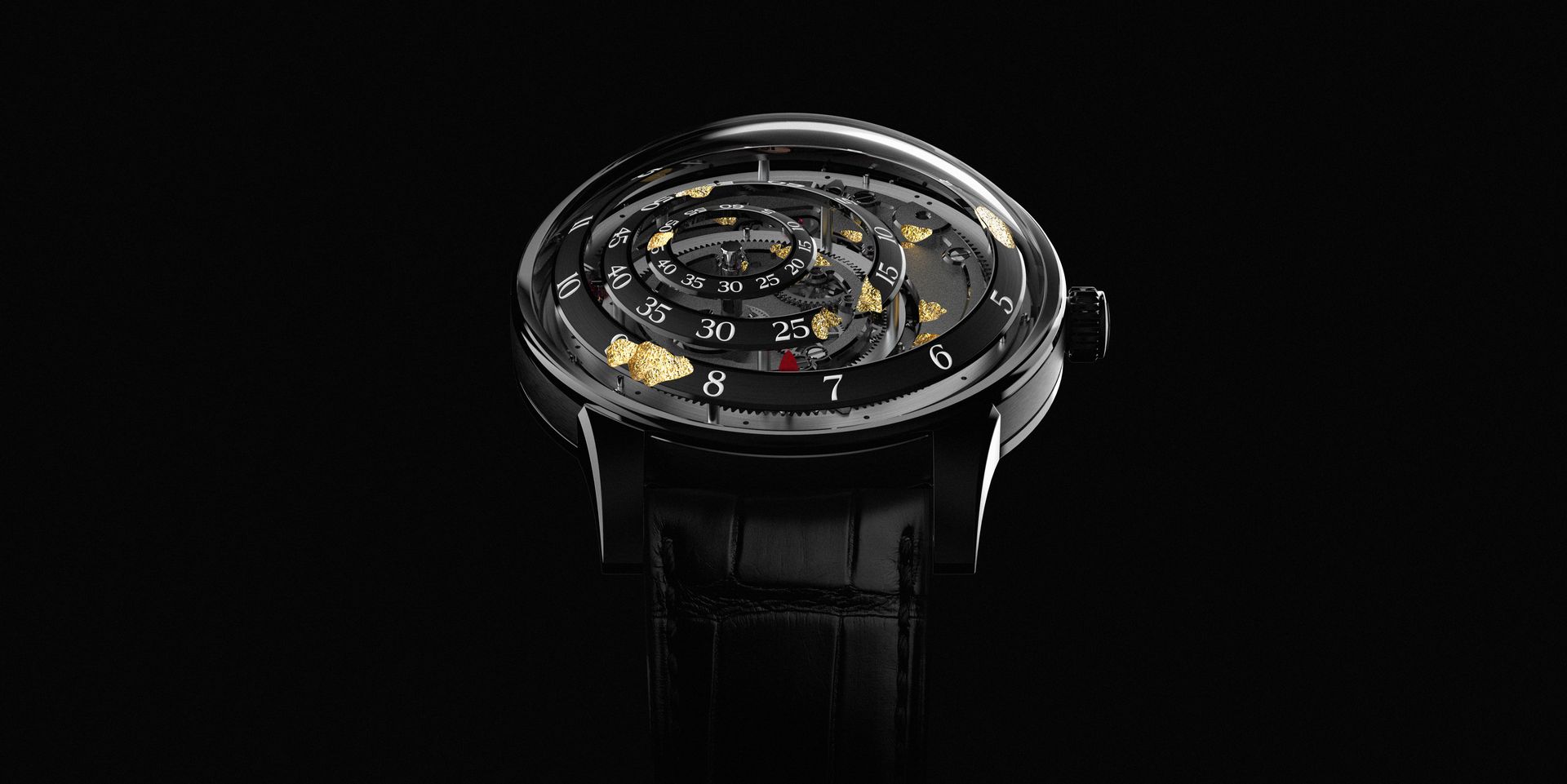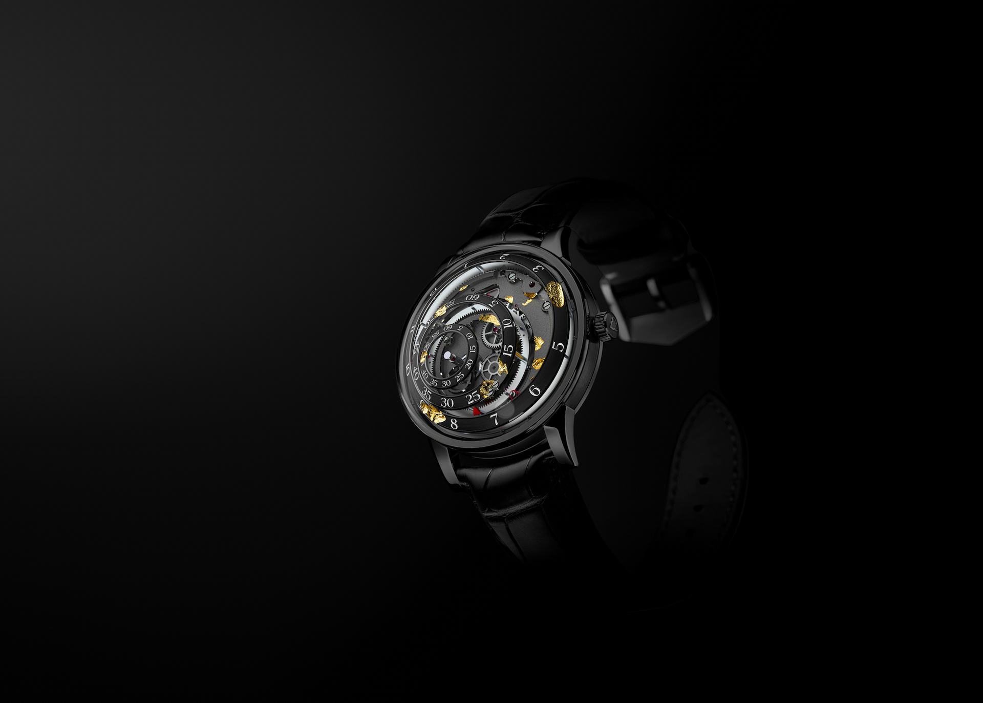 This piece was inspired from the Japanese art of Kintsugi (金継ぎ), which consists in repairing broken objects with gold. A profoundly inspiring philosophy: Kintsugi considers that scars carry stories that deserve to be valued. The story of this piece thus transcends physical mechanics and plunges its readers into the realm ofphilosophical contemplation. With its exposed fractures, this timepiece bears witness to the passage of time.